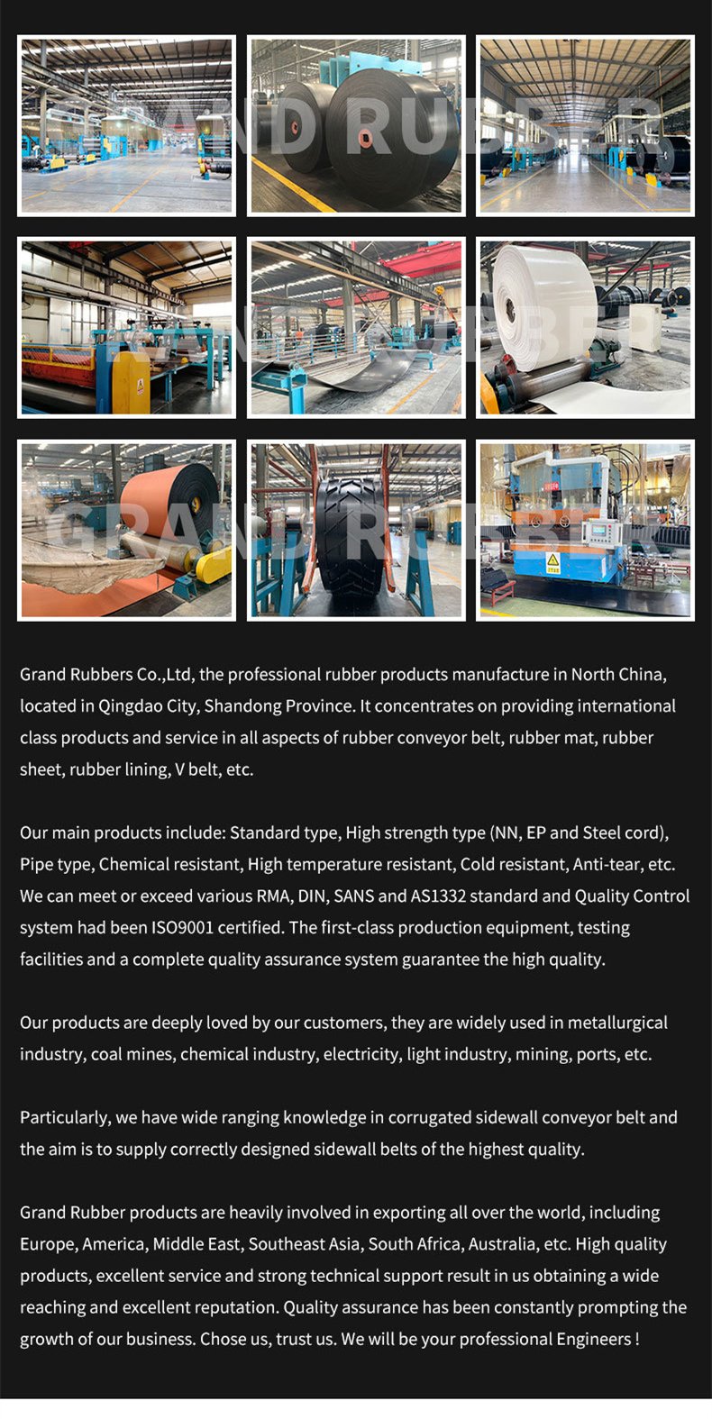 Banda transportadora de tela multicapa (tipo EP/NN), banda transportadora de cable de acero, banda transportadora Chevron, banda de pared lateral, banda transportadora blanca, banda para elevador de cangilones, banda filtrante y bandas transportadoras especiales resistentes al calor, al frío, al aceite, ignífugas y a la abrasión.
